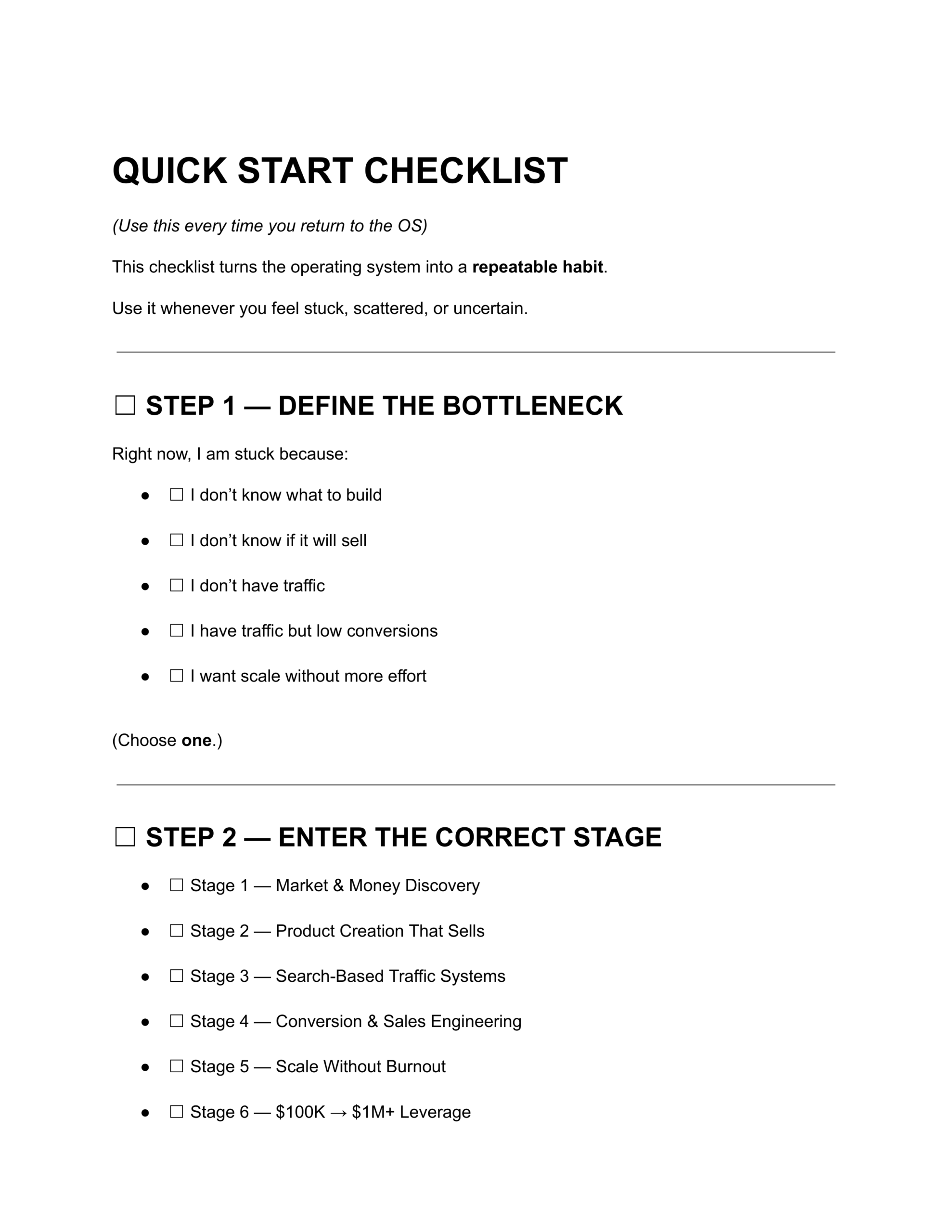 Internal Quick Start Checklist from the AI Product Builder’s Operating System.
